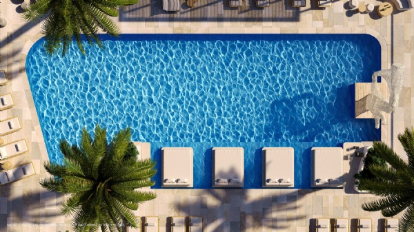 — Resort style pool with cabanas, floating daybeds, and a signature sculpture
